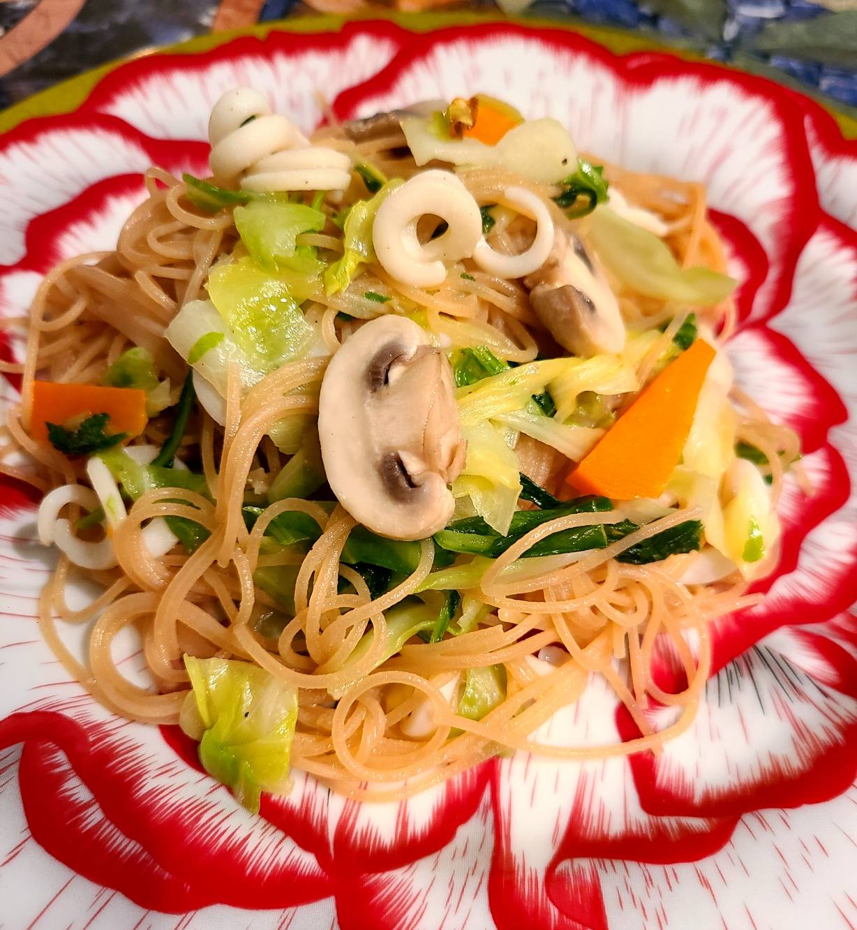 イカとマッシュルームとお野菜の高タンパクめん塩焼きそば!