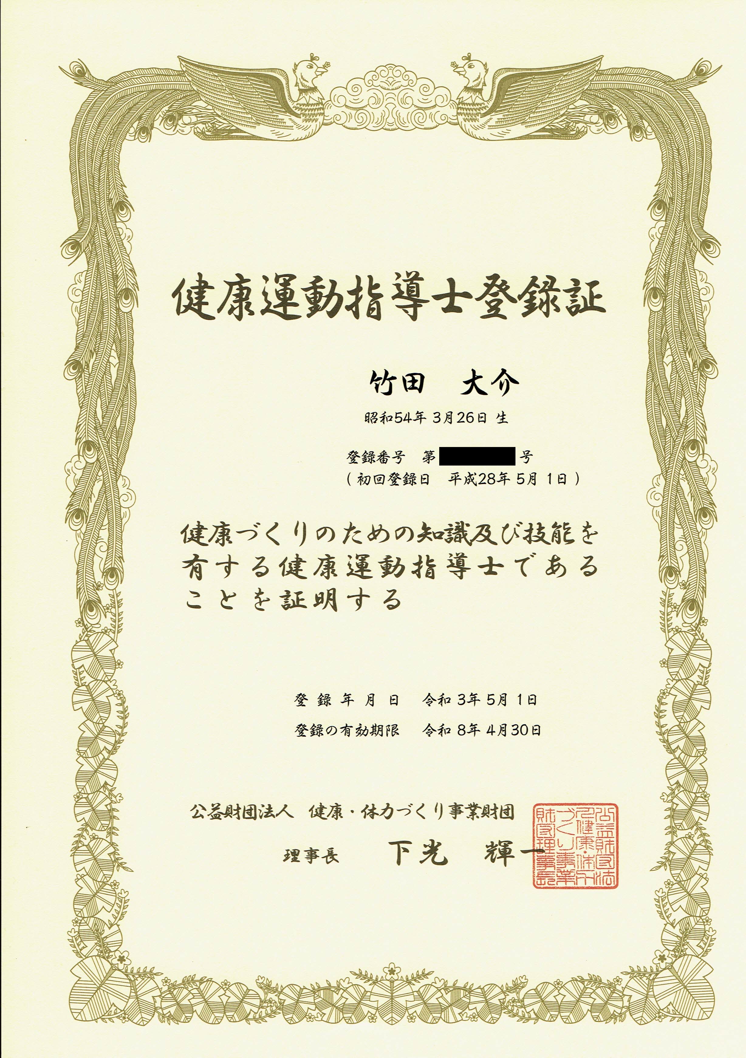 こちらの資格は公益財団法人 健康・体力づくり事業財団が発行する運動指導者資格で、資格登録証に記載の通り、「健康づくりのための知識及び技能を有する健康運動指導士」の資格です。