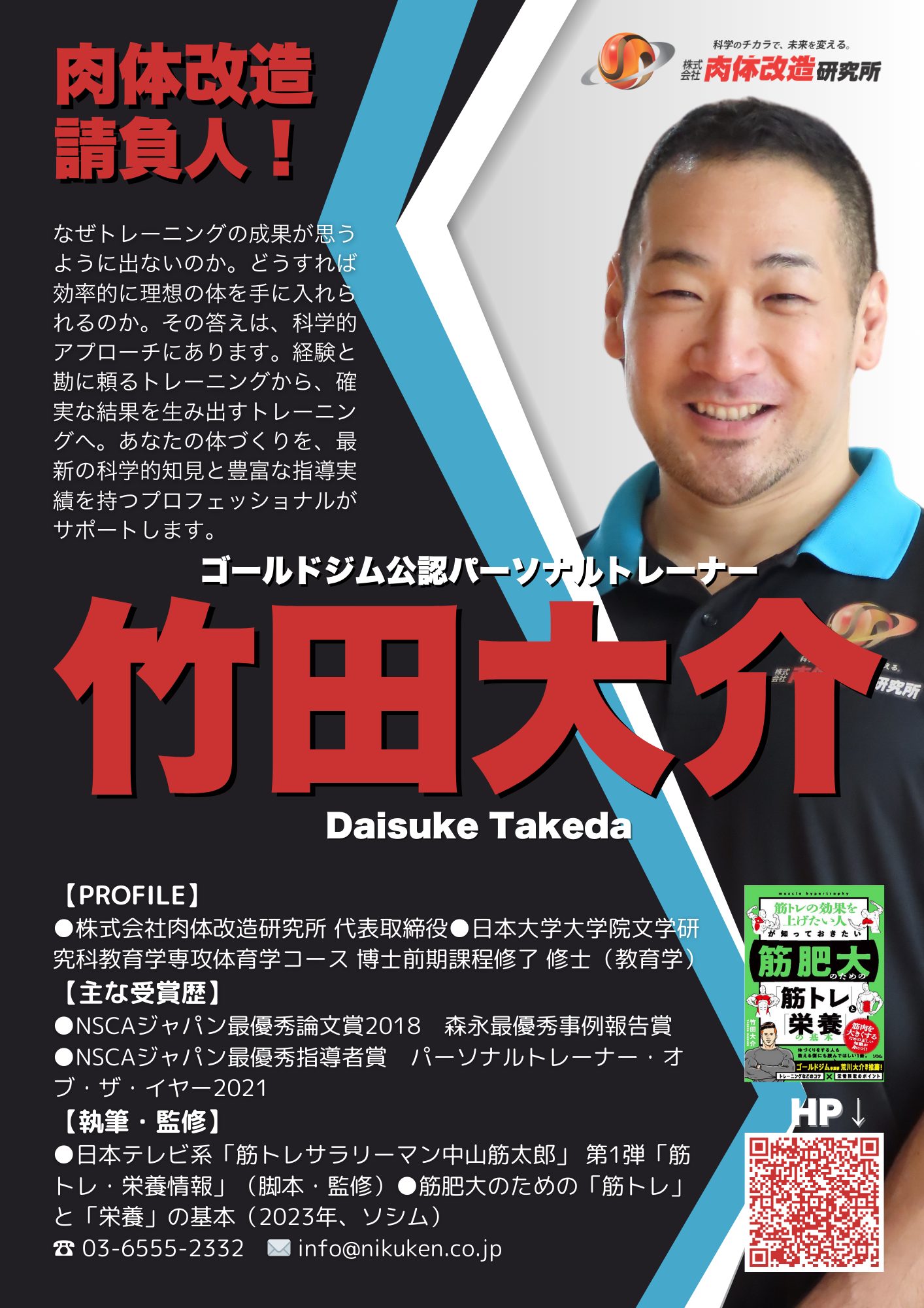 弊社では、日本大学大学院にて修士号の学位を授与され、福岡大学スポーツ科学部との共同研究やNSCAジャパン最優秀論文賞受賞といった学術研究実績を持つ代表 竹田大介が、責任をもって科学的根拠に基づいたエクササイズプログラムをご提供致します。