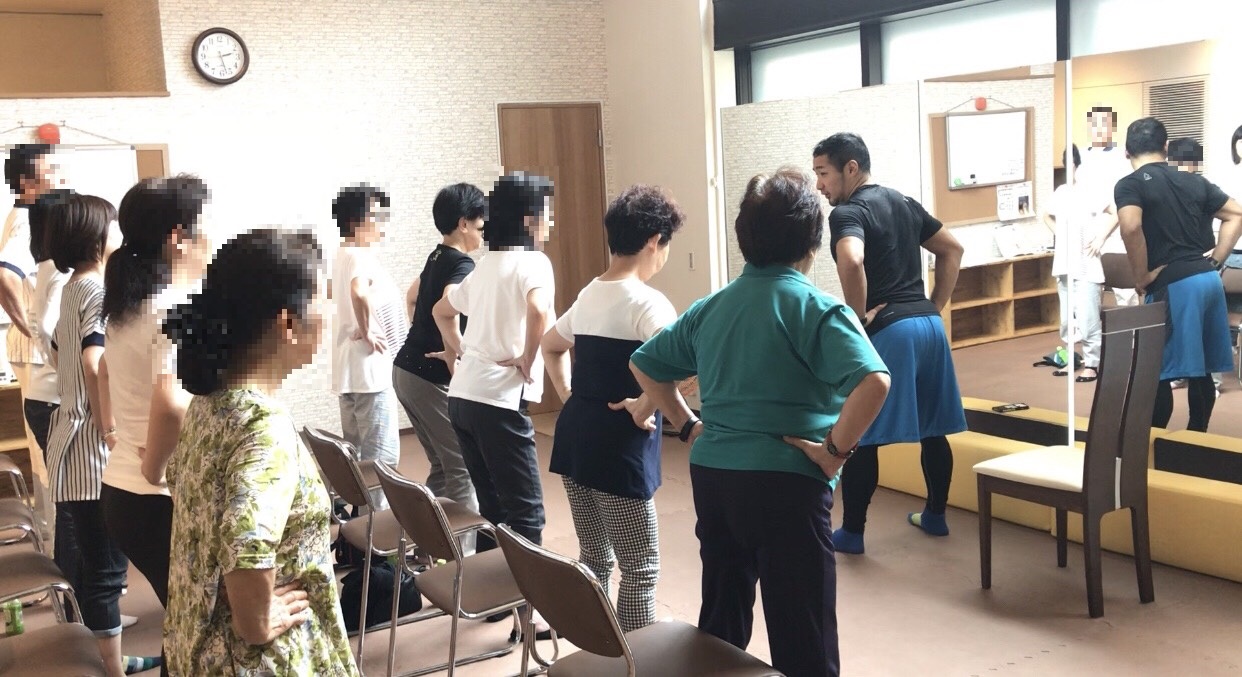普段運動をなさっていないご高齢の方が対象だったため、運動を始めるきっかけにして頂くことを目標に、まずは脳トレと椅子に座った状態で音楽に合わせての体操でウォーミングアップを行い、下肢筋肉を鍛えるエクササイズの基本種目であるスクワット(椅子座り立ち)の安全で効果的なフォームを習得して頂き、最後に使った筋肉のストレッチを行い終了しました。