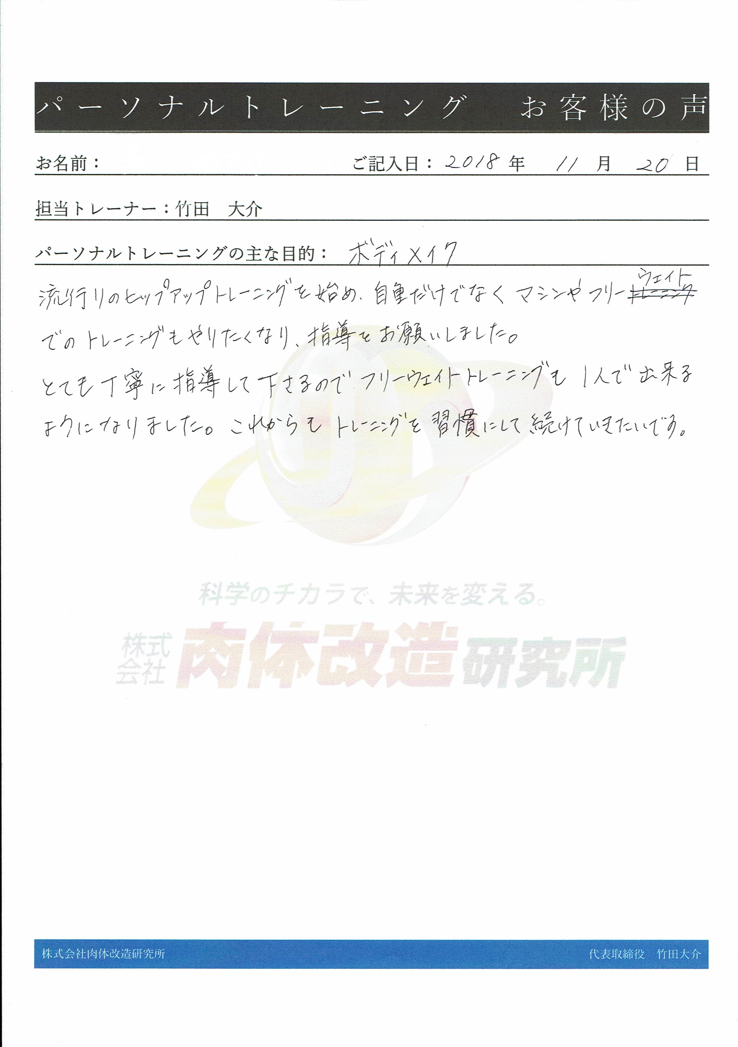 流行りのヒップアップトレーニングを始め、自重だけでなくマシンやフリーウェイトでのトレーニングをやりたくなり、指導をお願いしました。