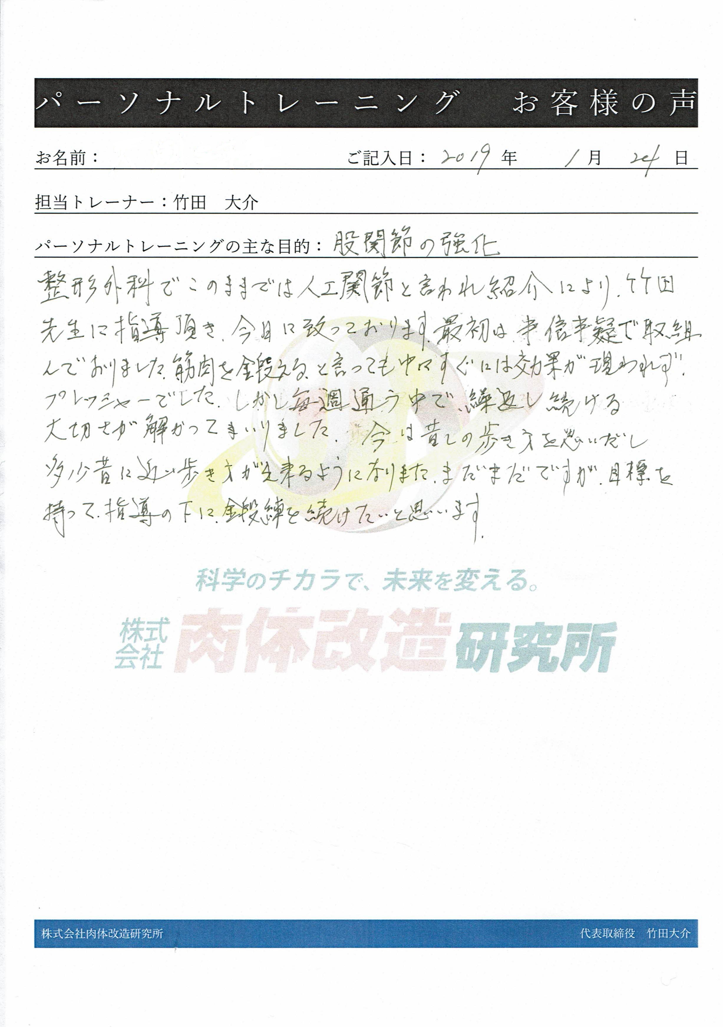 パーソナルトレーニング お客様の声(人工股関節置換術回避目的の60歳代男性)