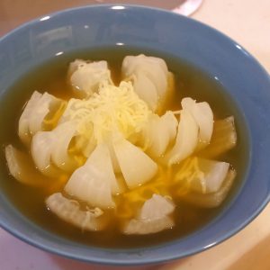 - 鍋にサラダ油を熱し、短冊に切ったベーコンとにんにくを炒める。ベーコン、にんにくとも色づき始めたら水とチキンスープの基を加え沸騰するまで温め、塩・こしょうで味を調える。