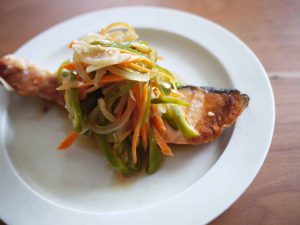 - さけは骨と皮を取り、一口大に切って塩・こしょう、酒で下味をつけ、小麦粉を薄くまぶす。