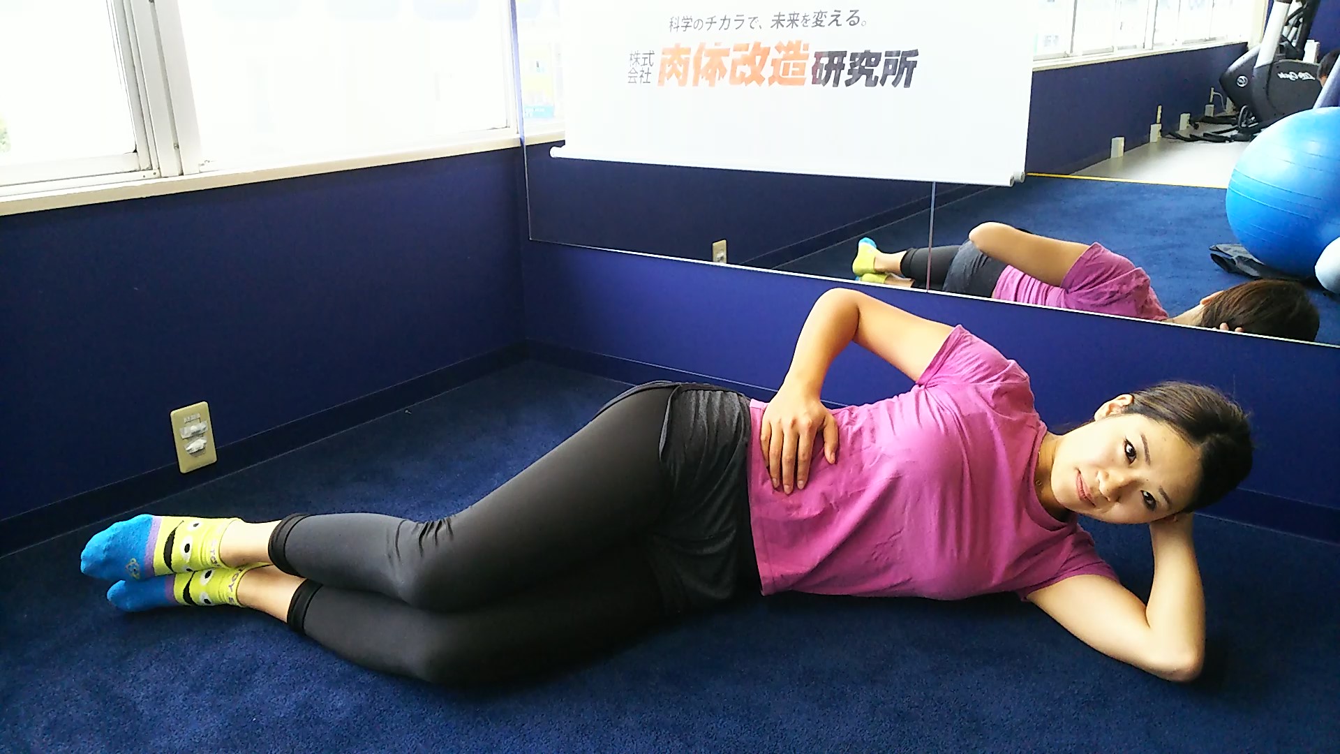横向きに寝て、両膝を軽く曲げ、下側の腕で頭を支え、上側の手は脇腹に置きます。
