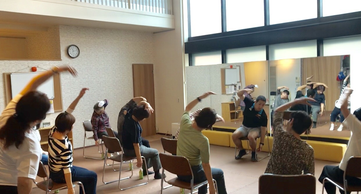脳トレで頭のウォームアップのあと、椅子に座った状態でできるウォーミングアップで身体を温め、