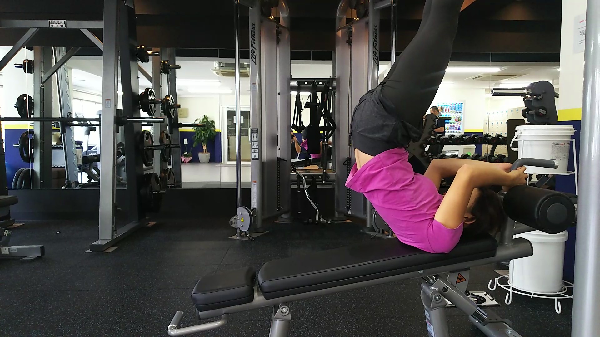 ベンチの傾斜を付けるほど強度が上がります。最初は床がフラットなストレッチエリアなどでやってみて、強度を上げたい場合にベンチを利用しましょう。