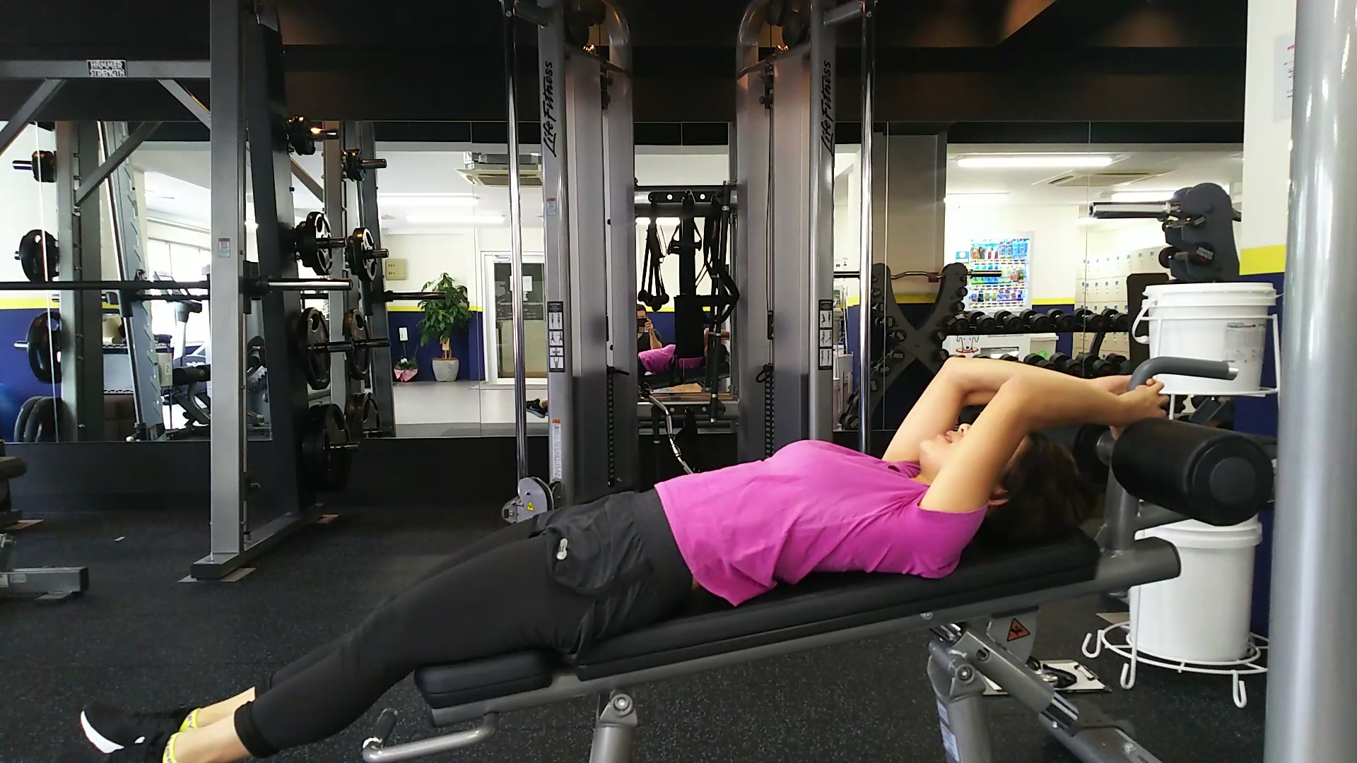 シットアップベンチに仰向けになり、ハンドルを掴みます。