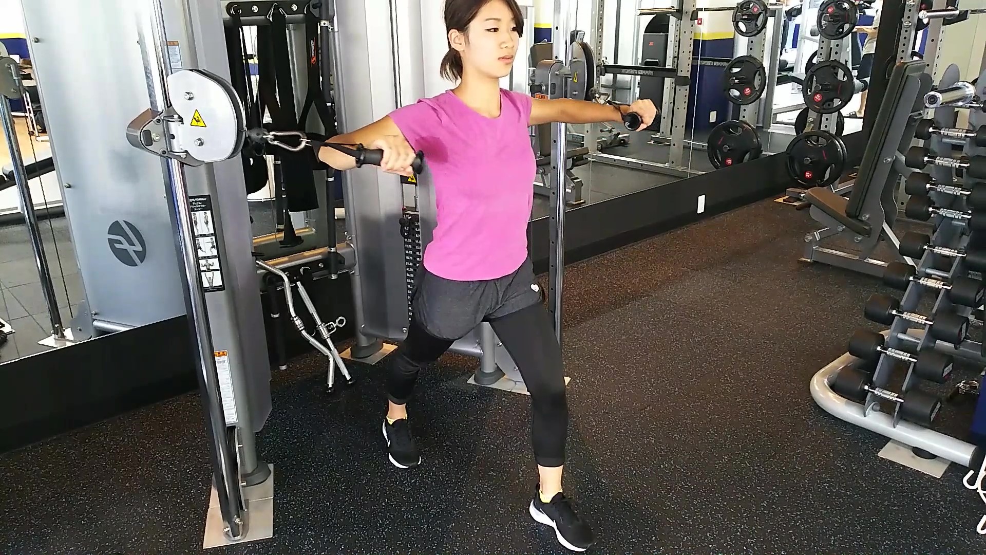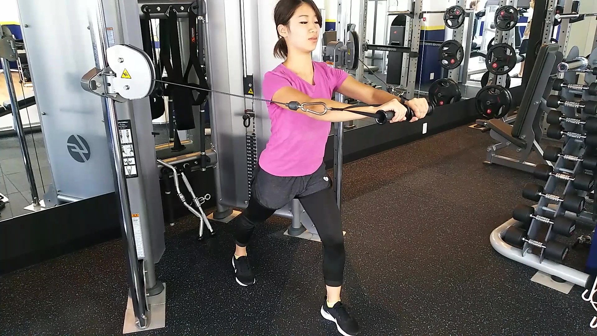 息を吐きながら、ケーブルの負荷に抵抗してハンドルを胸の前に押し出します。