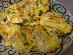 - 1の水けをふき、<B>を混ぜ合わせた卵液にくぐらせる。フライパンにサラダ油を熱し、弱火で両面を焼き、卵が固まってきたら再度卵液にくぐらせて焼く。これを卵液がなくなるまで繰り返し、最後は残った卵液を肉の上からかけて肉に火を通す。