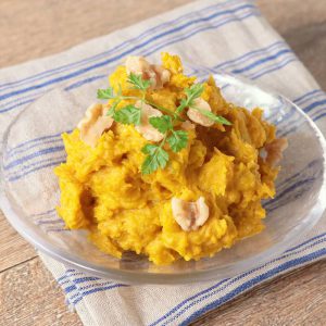 1. かぼちゃはワタを取り適度な大きさに切ってラップをし、電子レンジ(600w)で8分加熱する。上下を返してさらに2分加熱する。