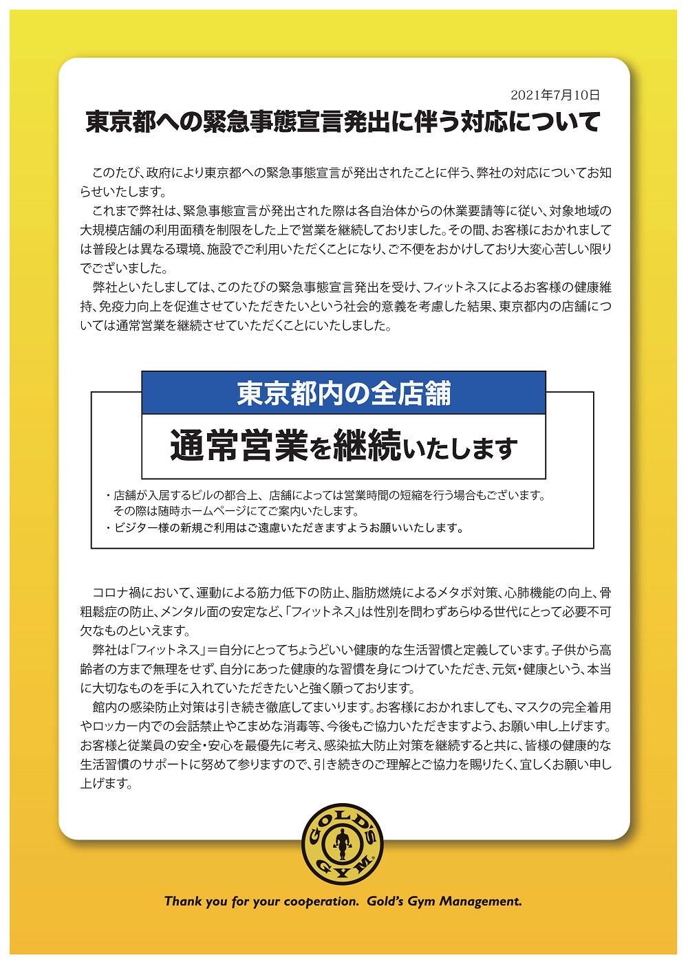 フィットネスによるお客様の健康維持、免疫力向上を促進させて頂きたいという社会的意義を考慮した結果、東京都内の店舗については通常営業を継続させていただくことにいたしました。