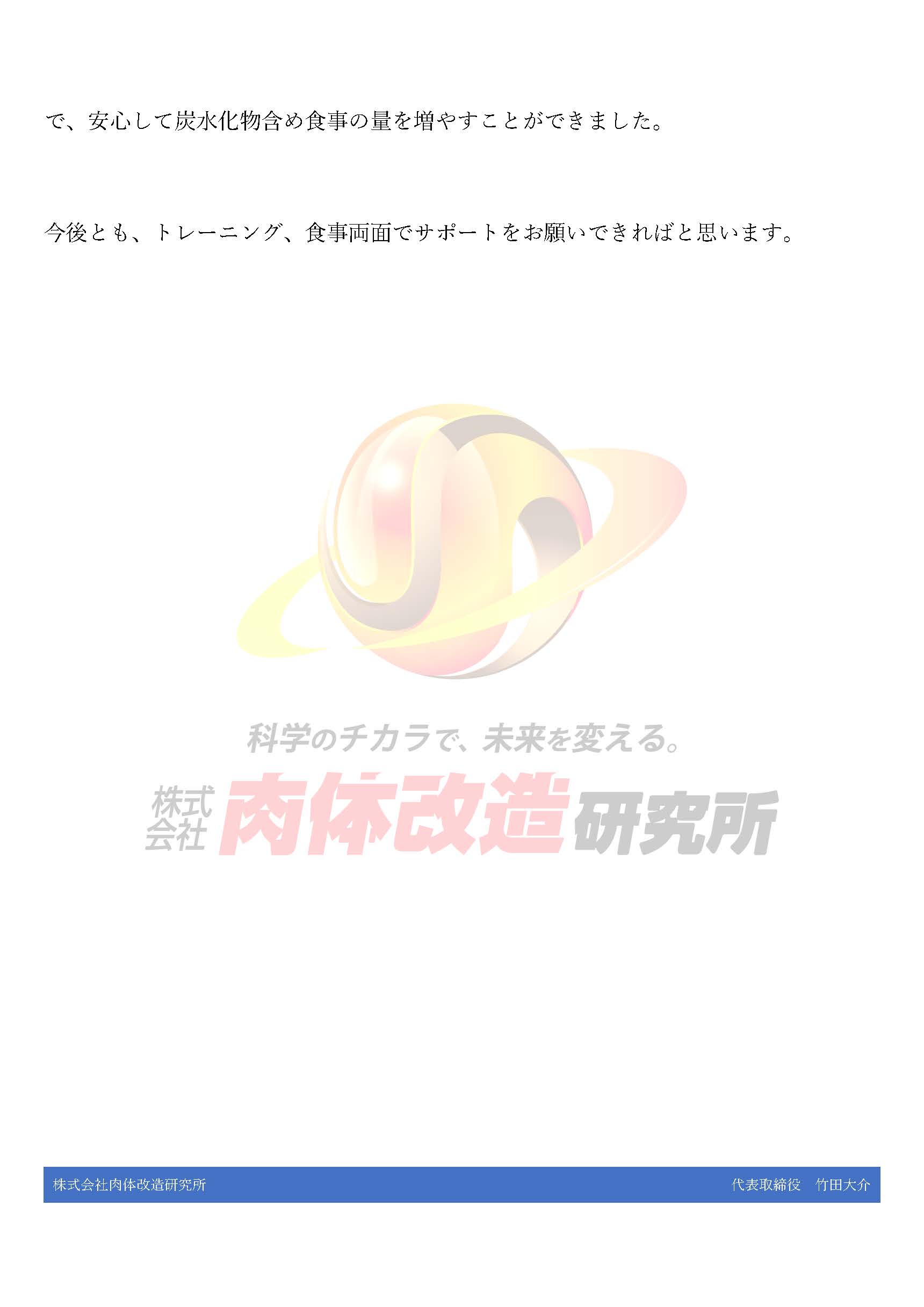 今後とも、トレーニング、食事両面でサポートをお願いできればと思います。