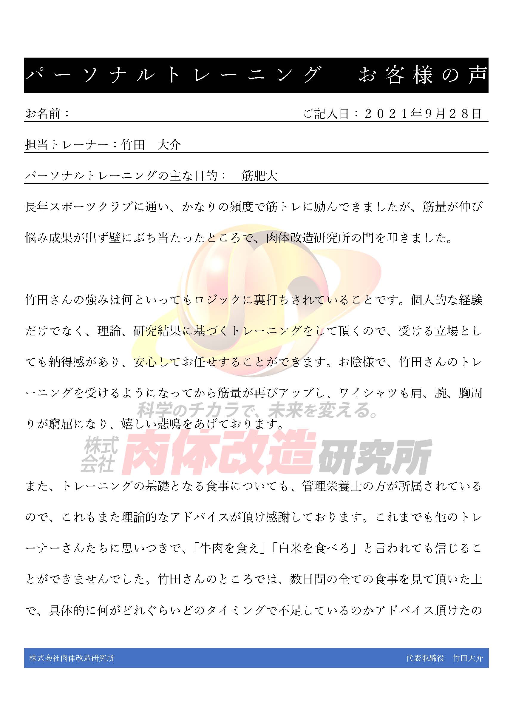 竹田さんの強みは何といってもロジックに裏打ちされていることです。個人的な経験だけでなく、理論、研究結果に基づくトレーニングをして頂くので、受ける立場としても納得感があり、安心してお任せすることができます。お陰様で、竹田さんのトレーニングを受けるようになってから筋量が再びアップし、ワイシャツも肩、腕、胸周りが窮屈になり、嬉しい悲鳴をあげております。