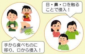 病原体に汚染された手指で口や鼻、眼などを触ることにより体内に侵入します。