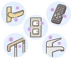 接触感染とは、感染した人の皮膚や粘膜の直接的な接触や、手、ドアノブ、手すり、スイッチ、ボタン、便座などの表面を介しての接触で病原体が付着することによる感染のことです。