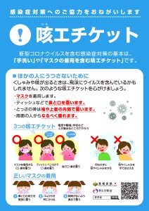 「咳(せき)エチケット」は、これらの感染症を他人に感染させないために、個人がせき・くしゃみをする際に、マスクやティッシュ、ハンカチ、袖を使って口や鼻をおさえることです。
