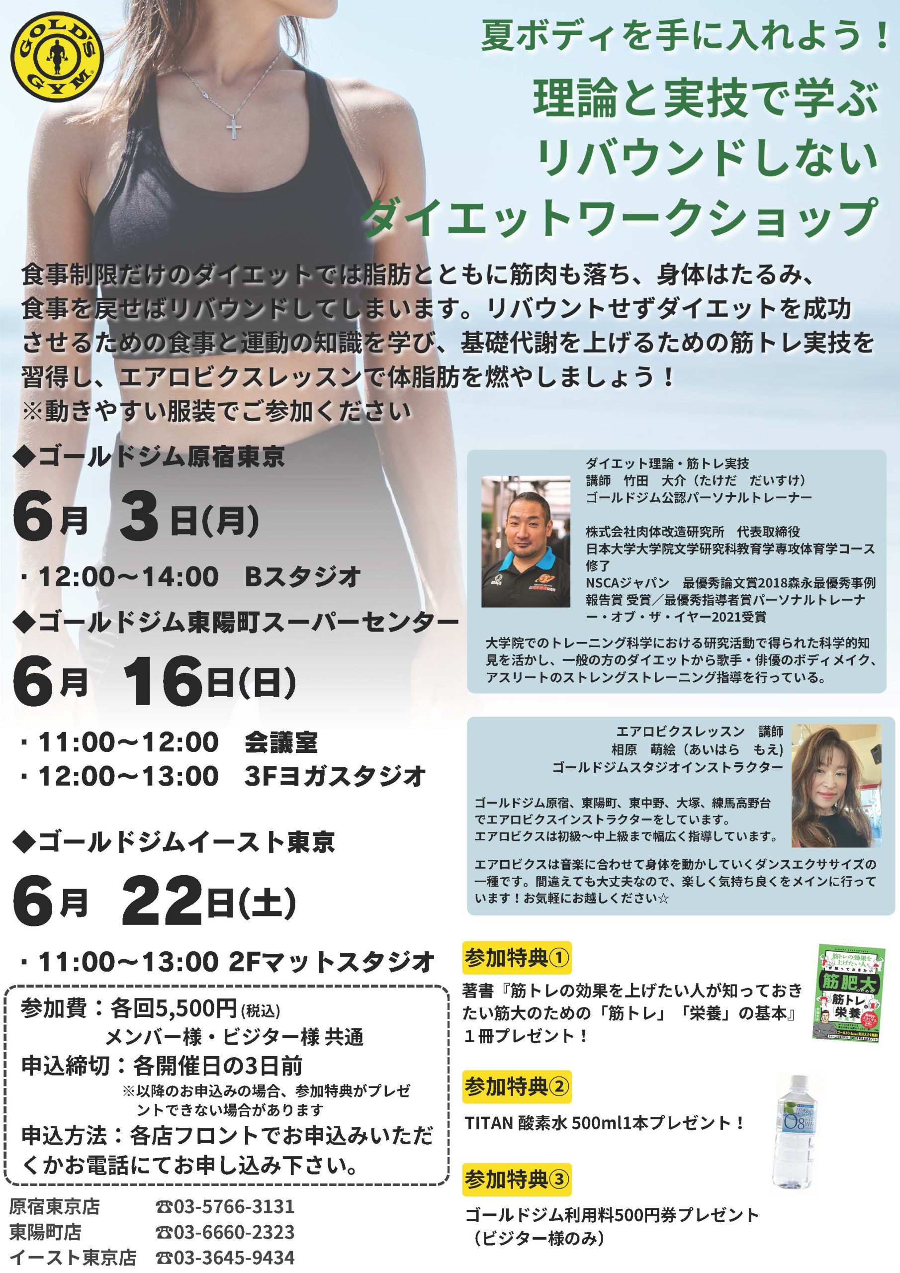 去る6月22日(土)、私の活動拠点であり日本のゴールドジム1号店であるゴールドジムイースト東京(江東区南砂町)にて、ゴールドジム原宿東京・東陽町スーパーセンター・東中野東京・練馬高野台東京・ノース東京(大塚)でエアロビクスインストラクターとして活動されている相原萌絵さんとのコラボで「夏ボディを手に入れよう!理論と実技で学ぶ リバウンドしないダイエットワークショップ」を開催して参りました!