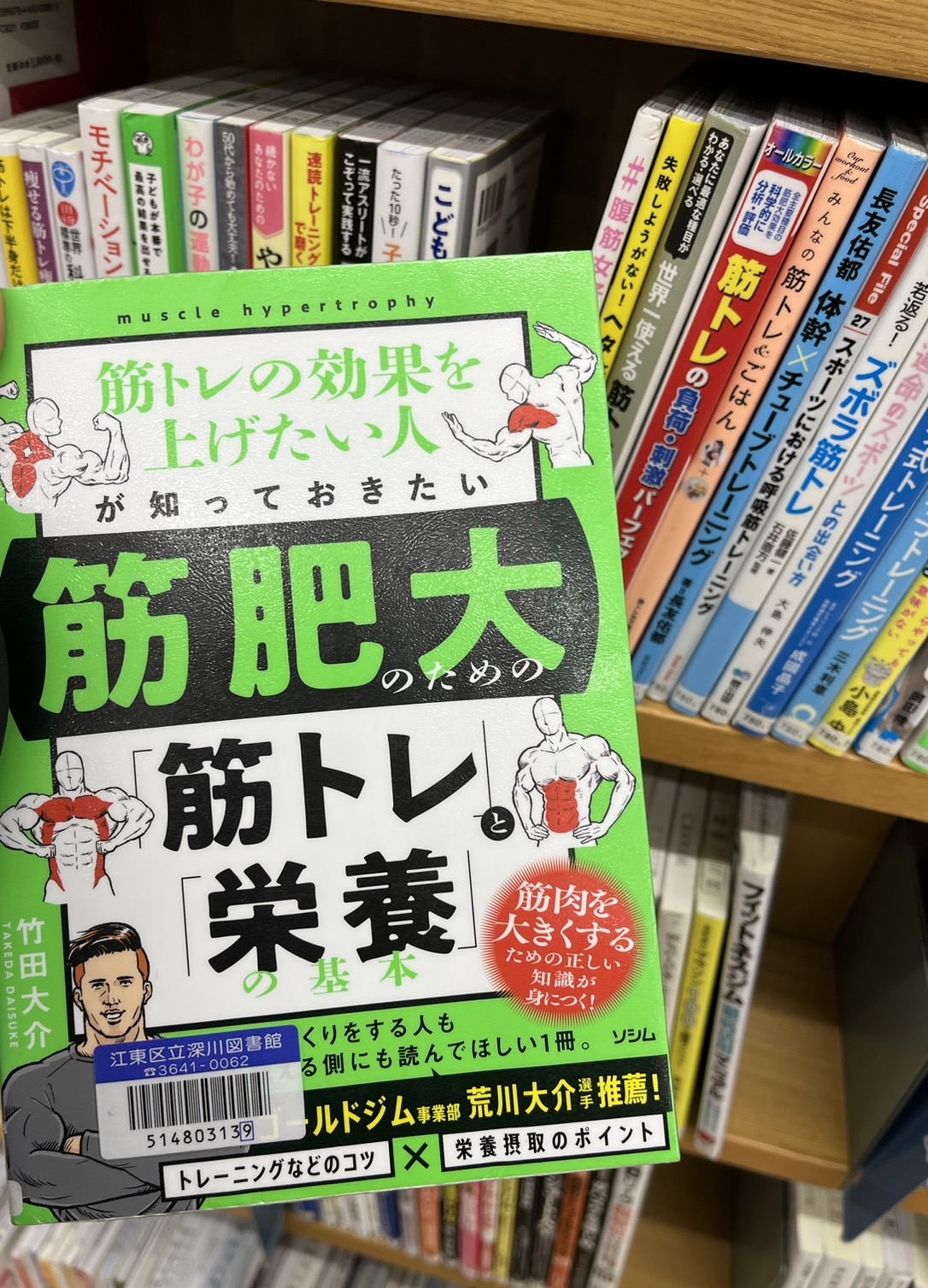 拙著『筋トレの効果を上げたい人が知っておきたい 筋肥大のための「筋トレ」と「栄養」の基本』をご購入頂いた方から、江東区立深川図書館に同書があった!と画像と共にご報告を頂きました!