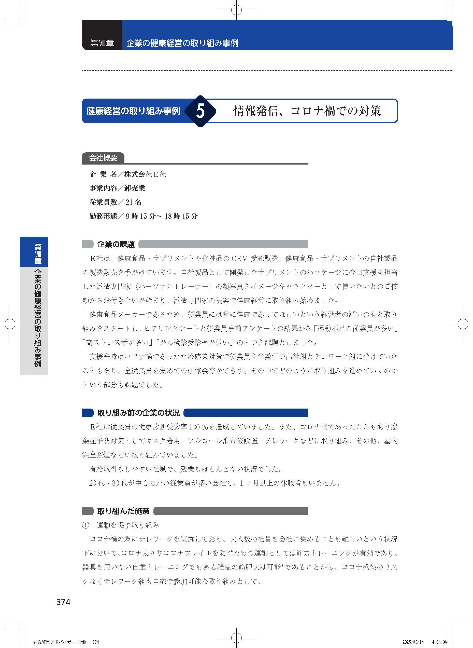 弊社代表の竹田大介が健康経営アドバイザー・エキスパートアドバイザー共通テキスト2025-2026(東京商工会議所)の第Ⅷ章「企業の健康経営の取り組み事例」5「情報発信、コロナ禍での対策」(374-375ページ)の執筆を担当させて頂きました。