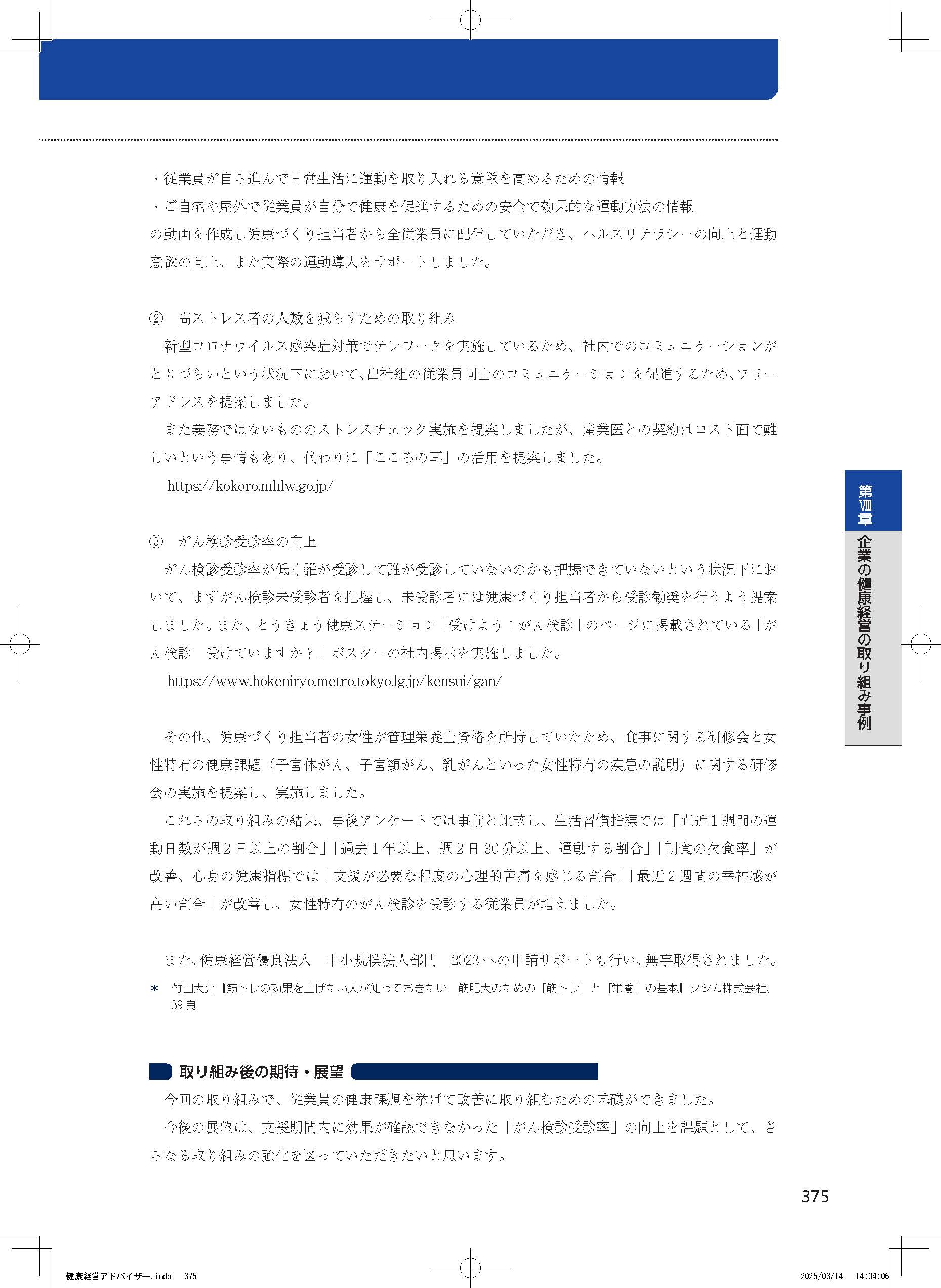 竹田大介は東京都の事業である東京都職域健康促進サポート事業 専門家派遣制度の専門家として都内中小企業様の健康経営の支援をさせて頂いており、顧問先の事例が好事例として今年度のテキストの執筆のご依頼を頂きました。