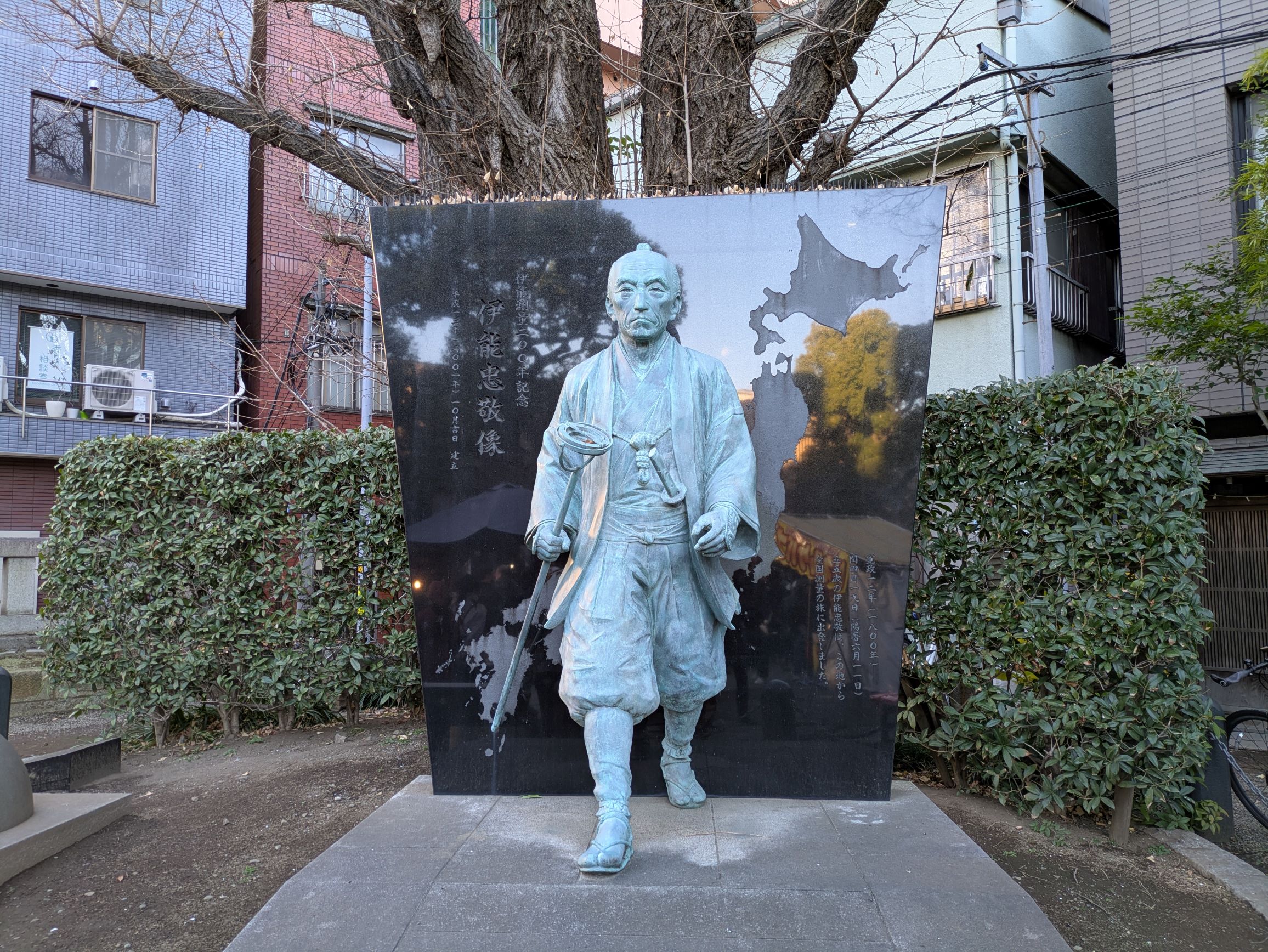 深川黒江町(現・門前仲町1丁目)に住んでいて富岡八幡宮にもよく参拝していた江戸時代後期の測量家・伊能忠敬翁の銅像もありました。