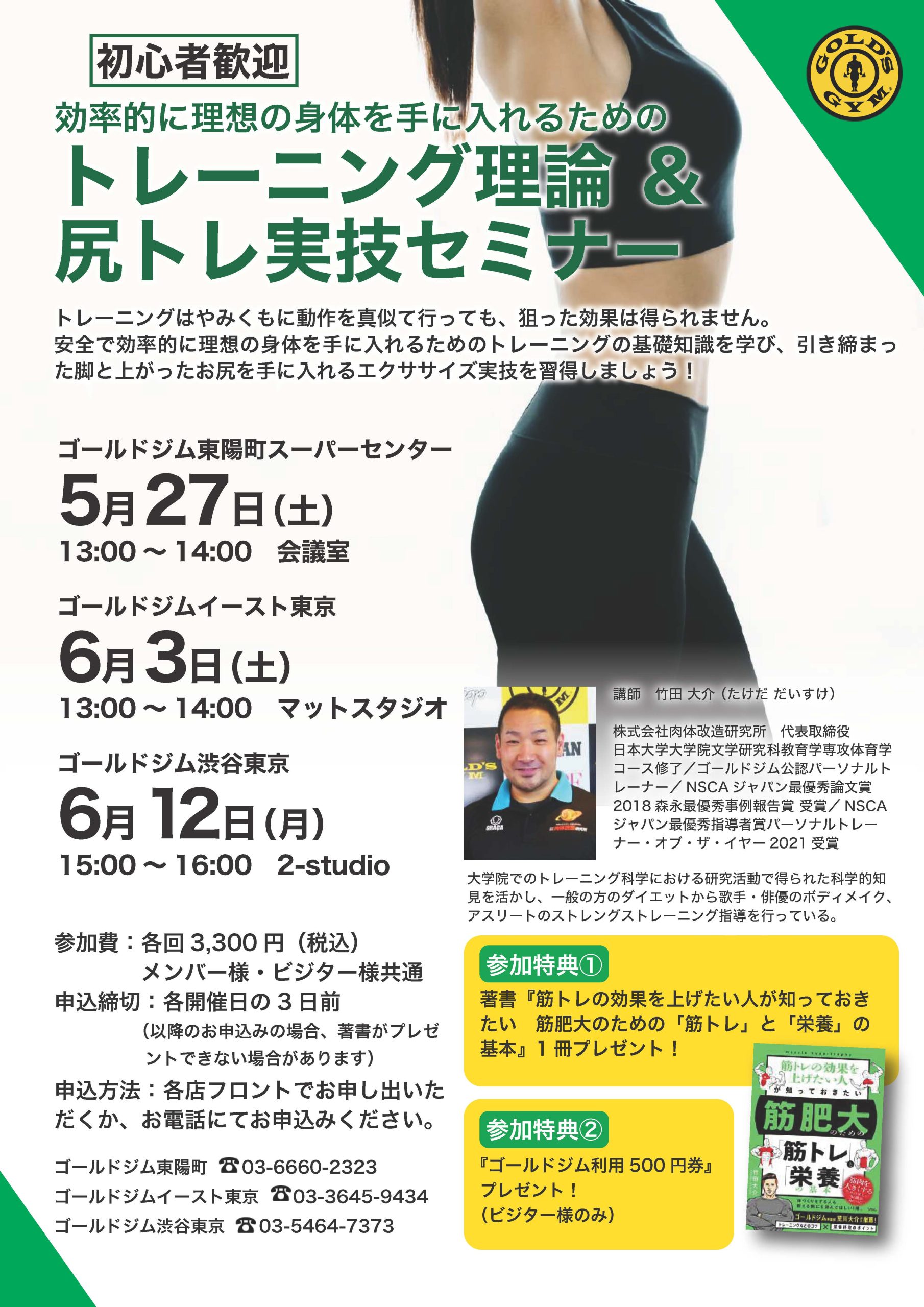 効率的に理想の身体を手に入れるための トレーニング理論&尻トレ実技セミナー/ゴールドジム渋谷東京・イースト東京(江東区南砂)・東陽町スーパーセンター